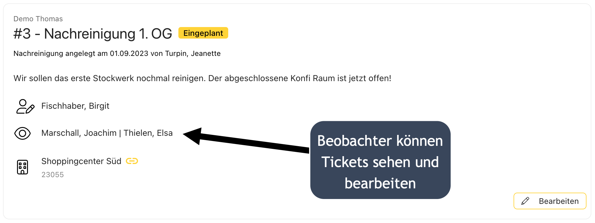 Mit den “Beobachtern” bei Tickets können jetzt beliebig viele Personen einem Ticket zugeordnet werden. Beobachter haben die gleichen Rechte wie Bearbeiter.