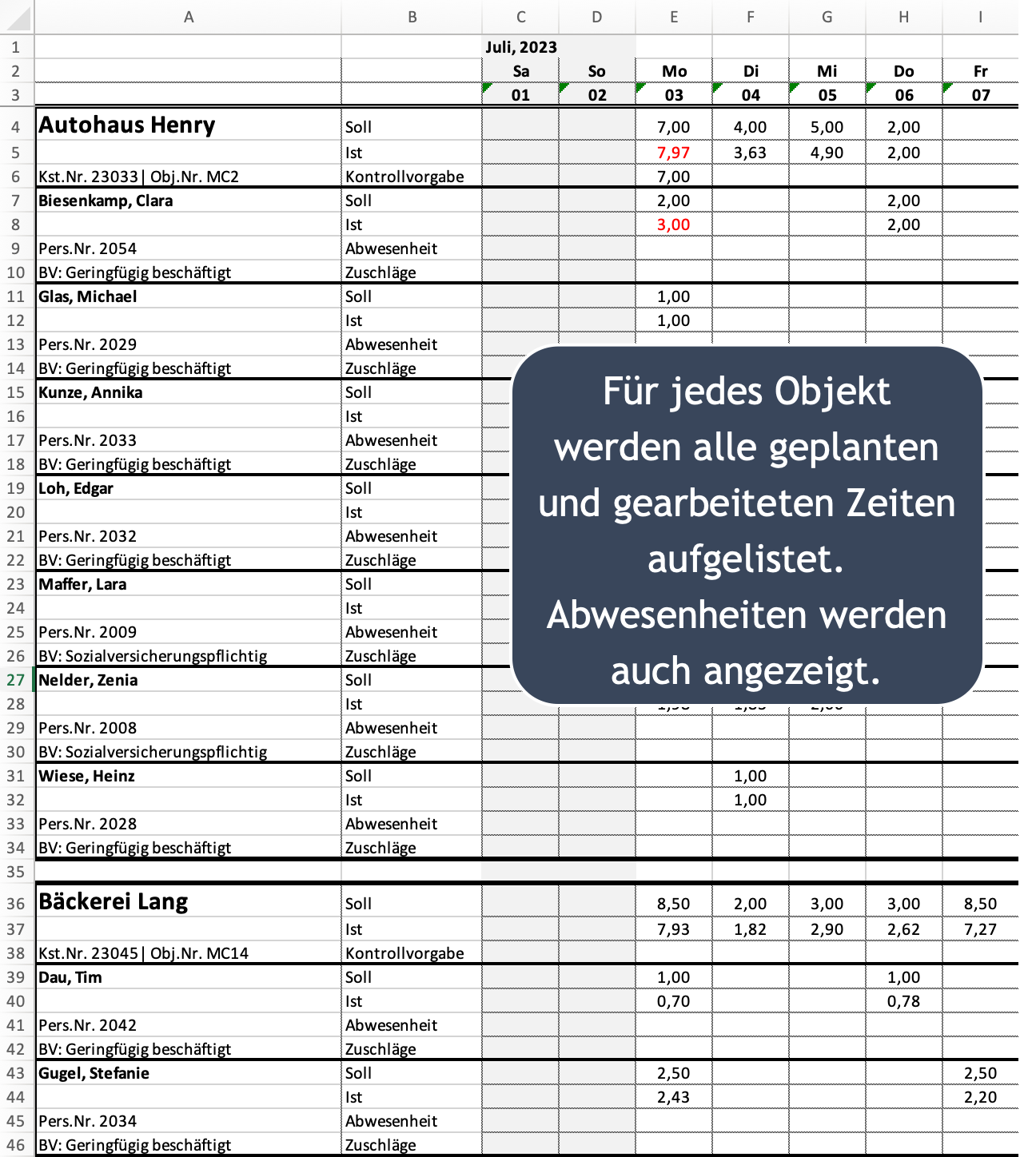 Die neue Auswertung kombiniert die beiden bestehenden Auswertungen für Objekte und Mitarbeiter und zeigt alle Daten gruppiert nach Objekt an. So können detaillierte Analysen gemacht werden, wie ein Objekt im letzten Monat abgeschnitten hat.