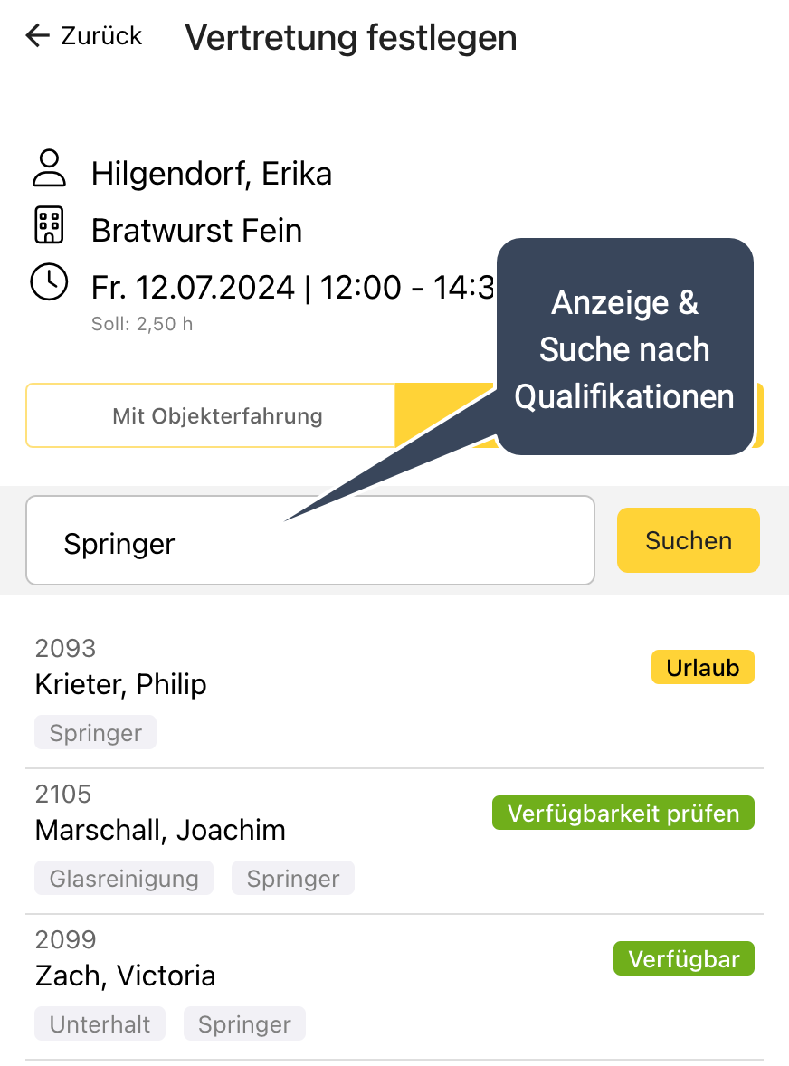 Im Vertretungsassistenten werden die Qualifikationen der Mitarbeiter angezeigt und über die Suche kann gezielt nach Qualifikation gefiltert werden. Qualifikationen können Mitarbeitern in den Stammdaten zugeordnet werden.