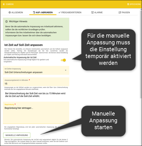 - Klicken Sie auf "Manuelle Anpassung" und wählen einen Zeitraum aus für den die Anpassung durchgeführt werden soll.