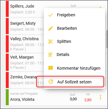 Bei jeder Arbeitszeit gibt es eine Quick-Action, die es ermöglicht die Ist-Zeit auf Soll-Zeit zu setzen. Diese Aktion müssen Sie manuell für jede Arbeitszeit anwenden.