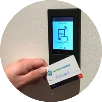 Diese Form der Zeiterfassung ist sehr einfach. Halte deine Blink ID Karte ans Terminal. Ein Signal ertönt und das Terminal zeigt an, dass die Erfassung startet.