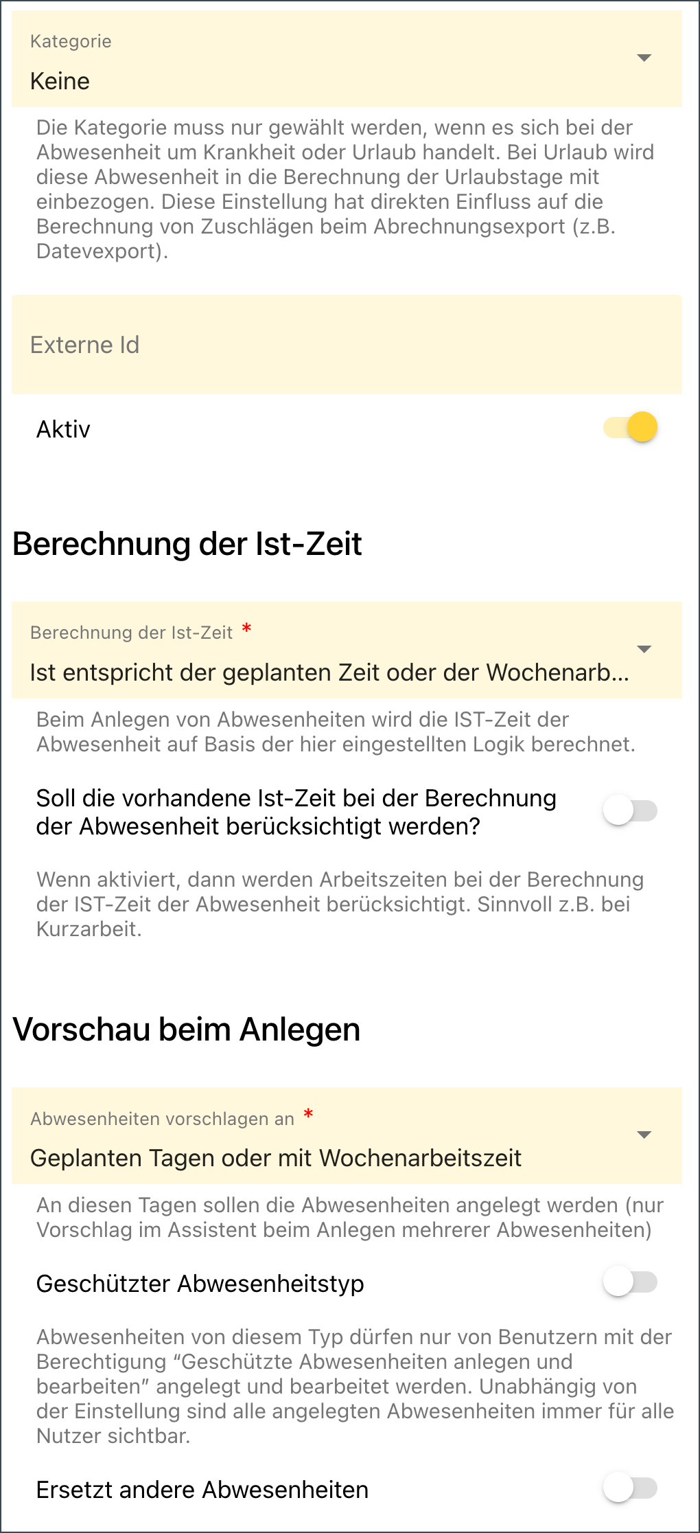Weitere Möglichkeiten zum Ausblenden oder deaktivieren von Abwesenheitstypen finden Sie in der Dokumentation.