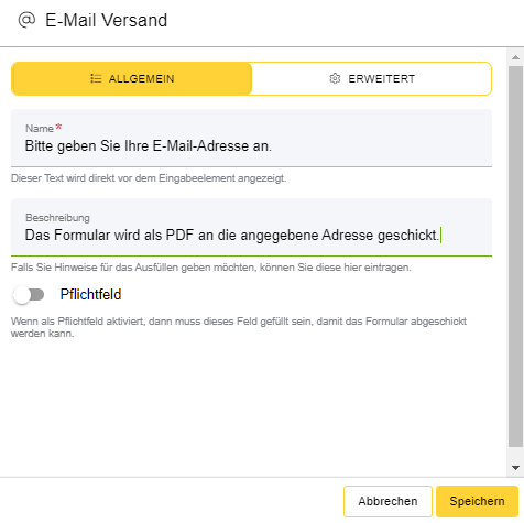 Der Benutzer kann eine gültige E-Mail Adresse angeben, an die das ausgefüllte Formular als PDF geschickt wird. Dies kannst du nutzen, um z.B. ein ausgefülltes Formular auch an den ausfüllenden Benutzer selbst zu schicken.