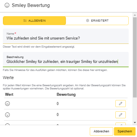Optional kannst du jedem Smiley (Wert) eine Bewertung zuordnen. Damit kannst du die Bewertungen nummerisch abbilden und später eine Auswertung vornehmen.