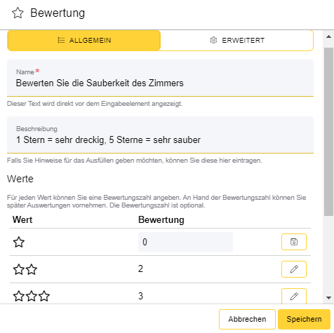 Optional kannst du jedem Stern (Wert) eine Bewertungszahl zuordnen. Damit kannst du die Bewertungsskala nummerisch abbilden und später eine prozentuale Auswertung vornehmen.