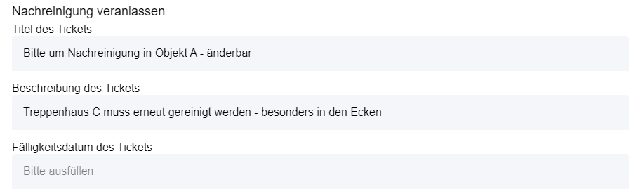 Du kannst damit automatisch Tickets erstellen lassen z.B. auch in Abhängigkeit vom Ausfüllen bestimmter Felder im Formular. So erstellst du beispielsweise automatische Tickets für Nachreinigungen, wenn bei der Objektbegehung Mängel festgestellt werden.