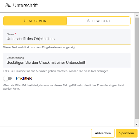 Optional kannst du das Feld als Pflichtfeld definieren, einen Hinweis zum Ausfüllen eintragen und unter “Erweitert” einen Standardwert vorgeben, der vom Ausfüller geändert werden kann.