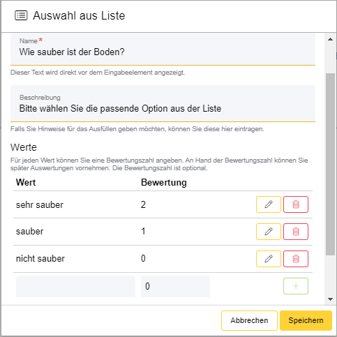 Optional kannst du außerdem jedem Listenelement (Wert) eine Bewertung(szahl) zuordnen. Damit kannst du quasi eine Skala abbilden und mit den Bewertungszahlen später eine Auswertung vornehmen.