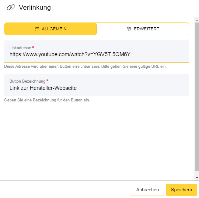 Hier kannst du einen Link auf externe Seite einfügen. Die Adresse wird über einen Button erreichbar sein. Die Bezeichnung für den Button kannst du definieren.