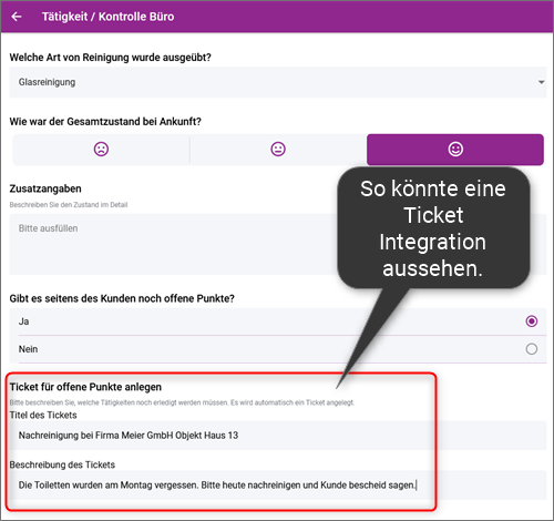 Mit der neuen Blink Check Version haben wir eine Integration mit Blink Active umgesetzt. Damit können Sie automatisch Tickets erstellen z.B. auch in Abhängigkeit vom Ausfüllen bestimmter Felder im Formular. So erstellen Sie bspw. automatische Tickets für Nachreinigungen, wenn bei der Objektbegehung Mängel festgestellt werden.