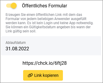 Formulare können über öffentliche Links online bereitgestellt werden und jeder der den Link kennt, kann das Formular ausfüllen. Mit dem Ablaufdatum werden öffentliche Links automatisch zu einem bestimmten Datum deaktiviert und sind nicht mehr nutzbar.
