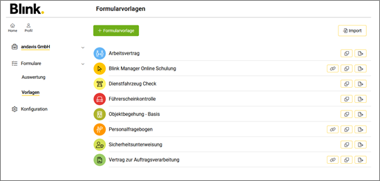 Für das Löschen von Vorlagen ist sowohl das Recht in der Berechtigungsgruppe “Blink Check Vorlagen verwalten” als auch das Recht “Formularvorlage bearbeiten” notwendig!