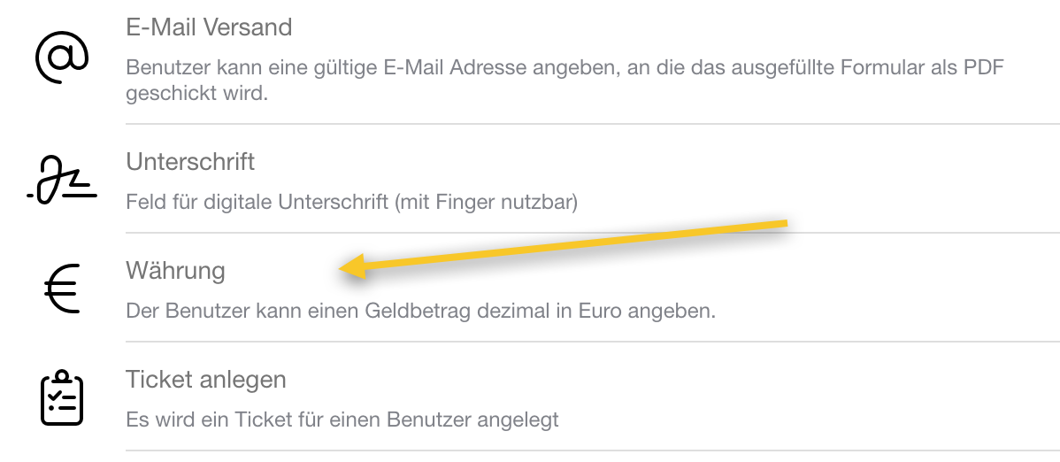 Ideal für Reisekostenabrechnungen oder Budgetanfragen ist das neue Feld für die Eingabe von € Beträgen. Es sind nur positive Dezimalzahlen erlaubt und bei der Ausgabe wird automatisch das € Symbol ergänzt.