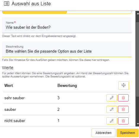 Sie haben das Eingabe Element Auswahl aus der Liste im Formular benutzt. Das Element heißt “Wie sauber ist der Boden?” In der Liste haben Sie folgende Werte mit Bewertungen definiert: sehr sauber = 3, sauber = 2, nicht sauber = 1
