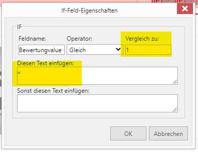 2. IF Feld → "Value" des passenden Eingabe Elements in "Feldname" eintragen (z.B. Bewertungvalue) und gelb markierte Felder mit entsprechenden Werten pflegen → "Vergleich zu:" 1 eintragen → "Diesen Text einfügen:" «««« eintragen