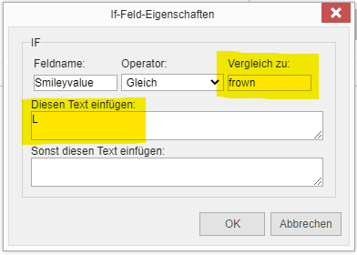 1. IF Feld → "Value" des passenden Eingabe Elements in "Feldname" eintragen (heißt z.B. ihr Eingabe Element “SmileyZimmer” geben Sie bei Feldname “SmileyZimmerValue” ein) und gelb markierte Felder mit entsprechenden Werten pflegen → "Vergleich zu:" frown eintragen → "Diesen Text einfügen:" L eintragen