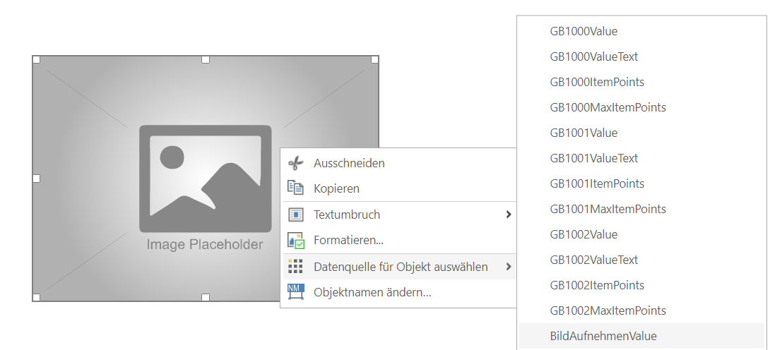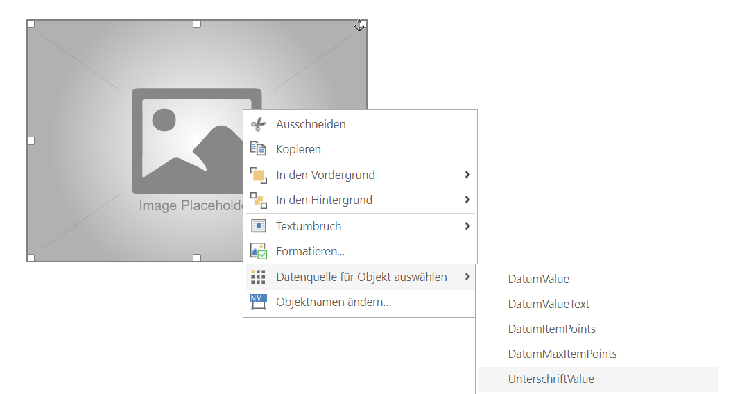 Nun müsste der "Bild Platzhalter-Objekt" rot hinterlegt sein → Rechtsklick Menüpunkt "Datenquelle für Objekt auswählen" klicken und "ImageData" auswählen