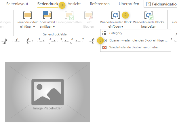 Auf Menüpunkt "Seriendruck" klicken und dann auf "Widerholender Block einfügen" klicken → Menüpunkt "Eigenen wiederholenden Block einfügen" auswählen