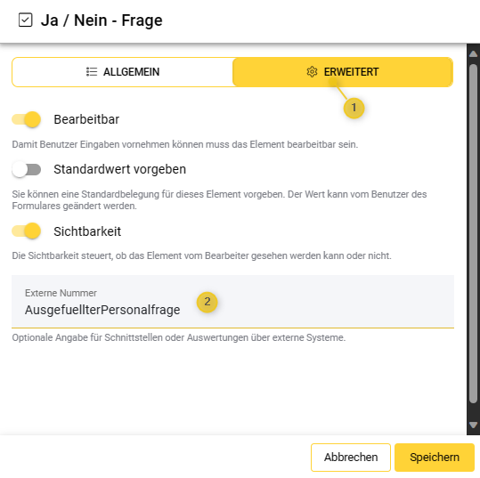 Ja/Nein-Frage | ja bzw. nein, je nach Auswahl | ExterneNummerValueText |
