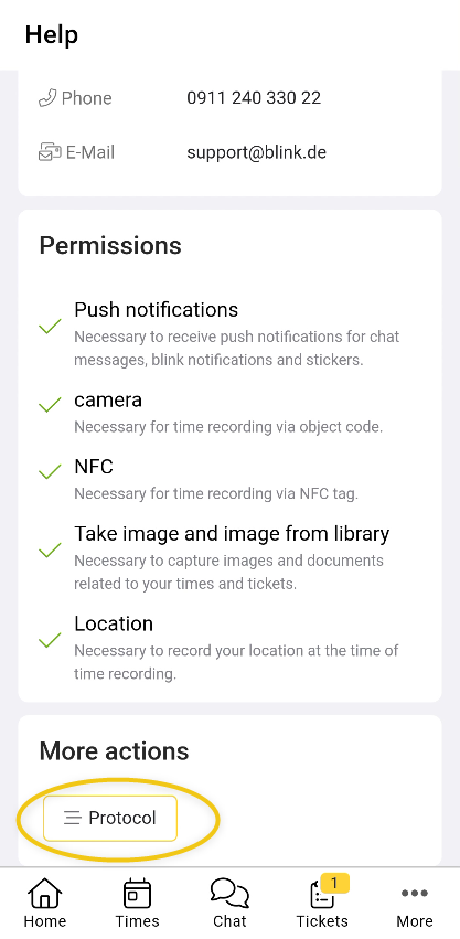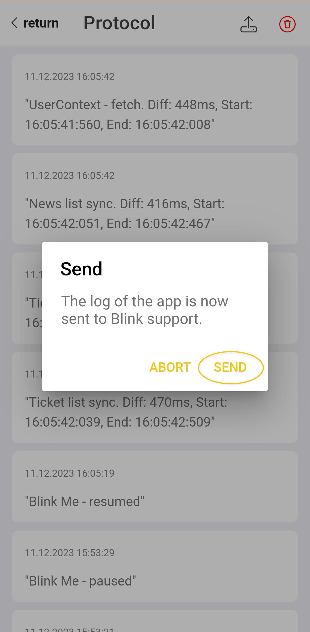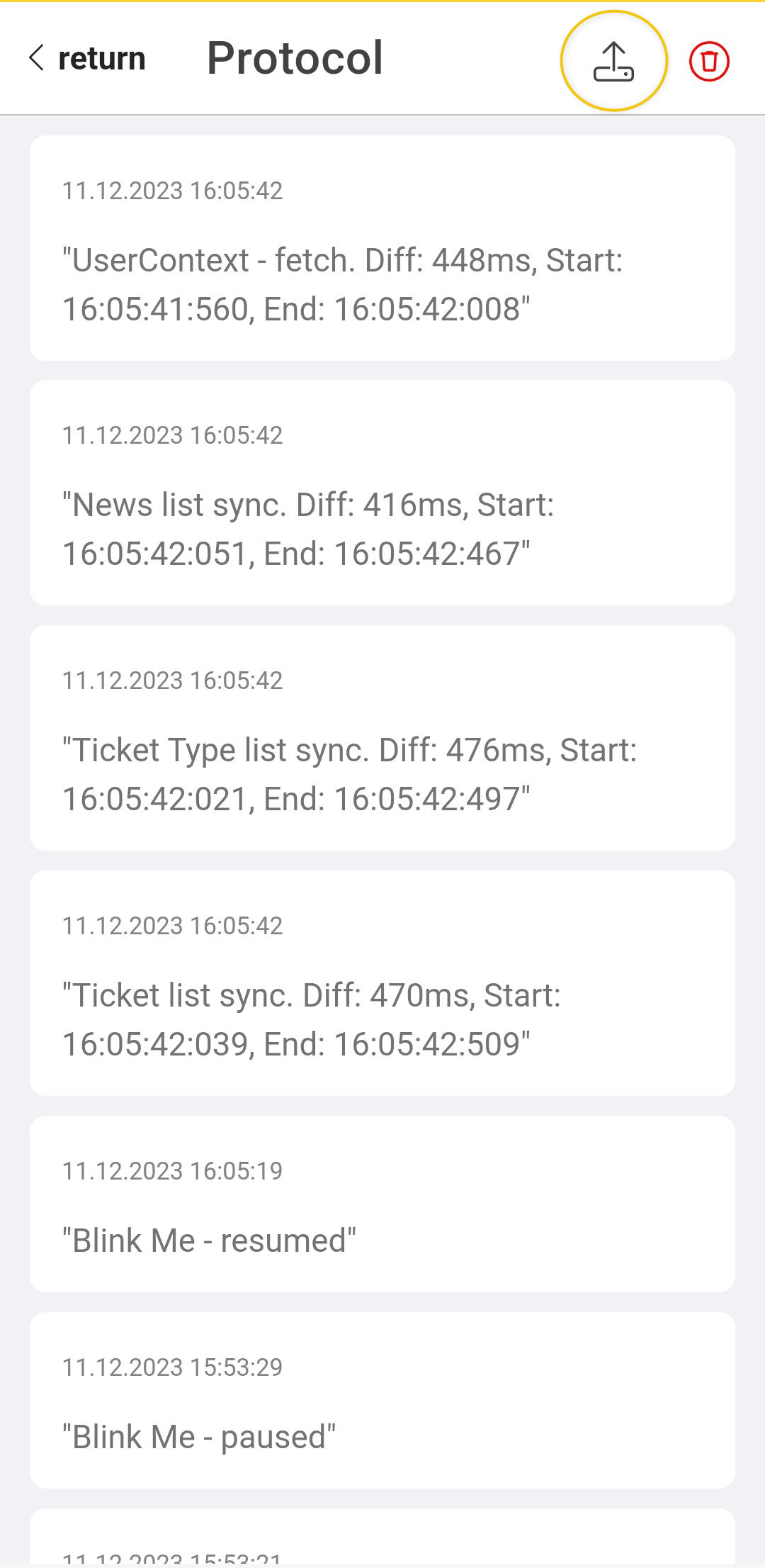 At the bottom of the ‘’More actions‘’ section is the Log function, in which the system saves all technical app processes. The texts are not relevant for the user themselves, but provide important information for the support team: The log can provide information about where a technical error may have occurred. If something is not working with the app, it may therefore be necessary to provide the support team with this log information: