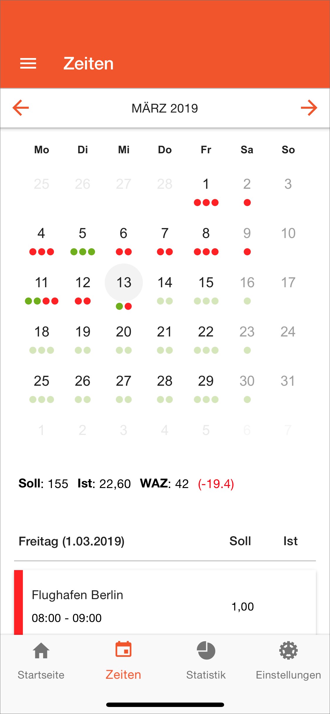 Mehr Übersicht auf der Zeiten Seite. Ein Kalender zeigt eine Übersicht für den aktuell ausgewählten Zeitraum.