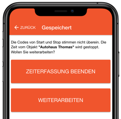 Diese Funktion ist ideal, wenn z.B. die Wegezeit zwischen zwei Objekten automatisch mit berücksichtigt werden soll. Aber auch wenn Leistungen "gewechselt" werden kann diese Funktion eingesetzt werden. Dazu wurden in der neuen Version Anpassungen vorgenommen, damit der "Weiterarbeiten" Dialog auch angezeigt wird, wenn zwei verschiedene QR Codes innerhalb des selben Objekts gescannt werden.