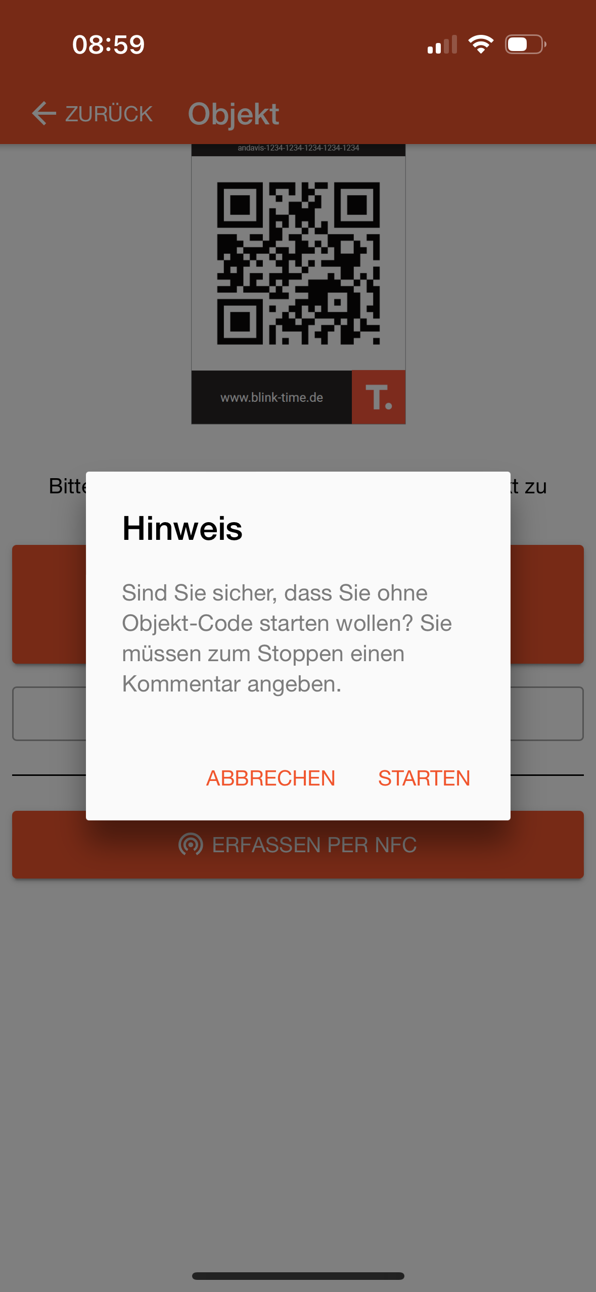 Warnhinweis, wenn ohne QR Code Zeit erfasst wird