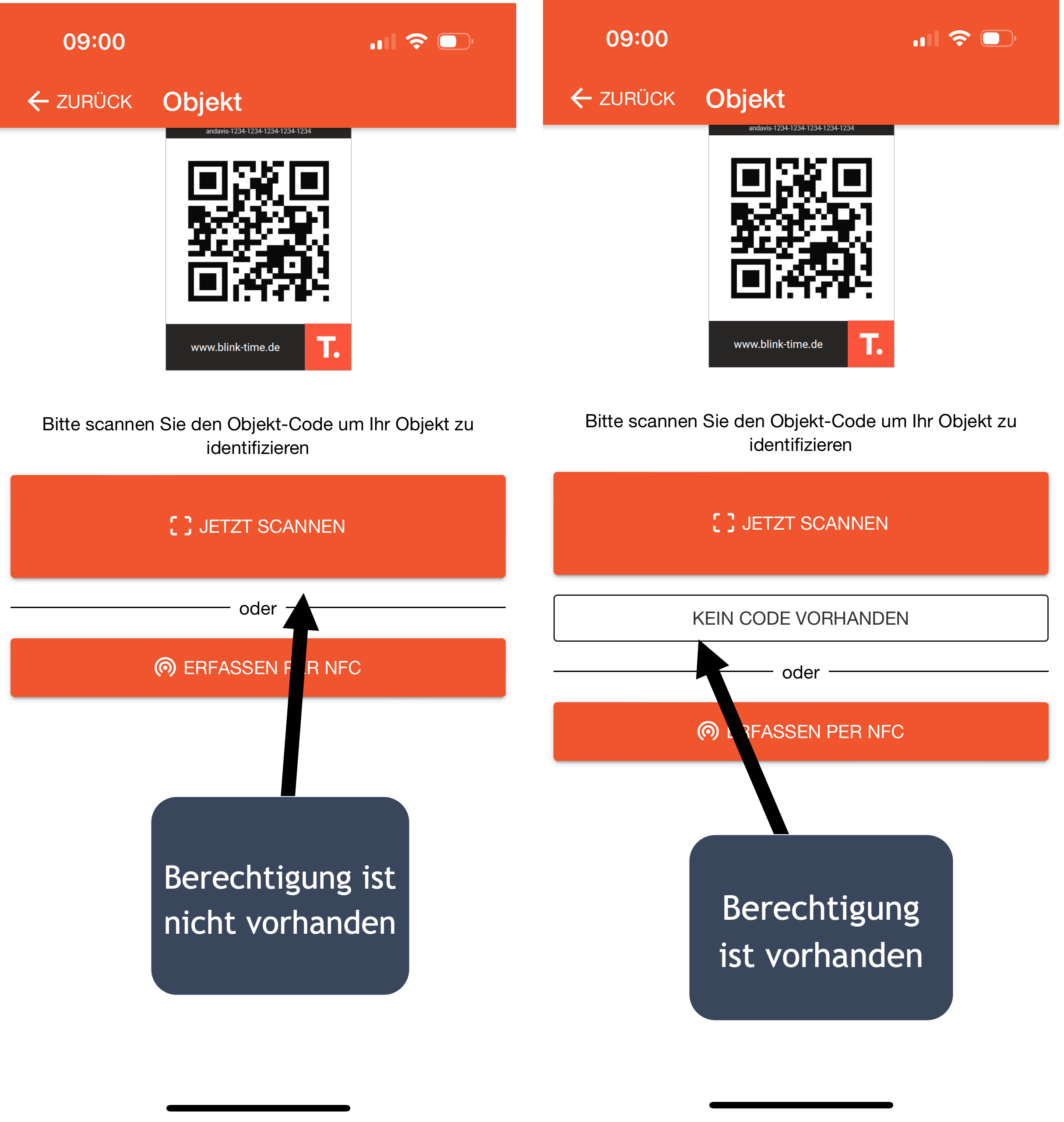 Wenn die Berechtigung nicht gesetzt ist, dann wird der Button “ohne QR Code” beim Starten der Zeiterfassung ausgeblendet, d.h. die Zeiterfassung kann nur mit QR Code oder NFC Code gestartet werden.