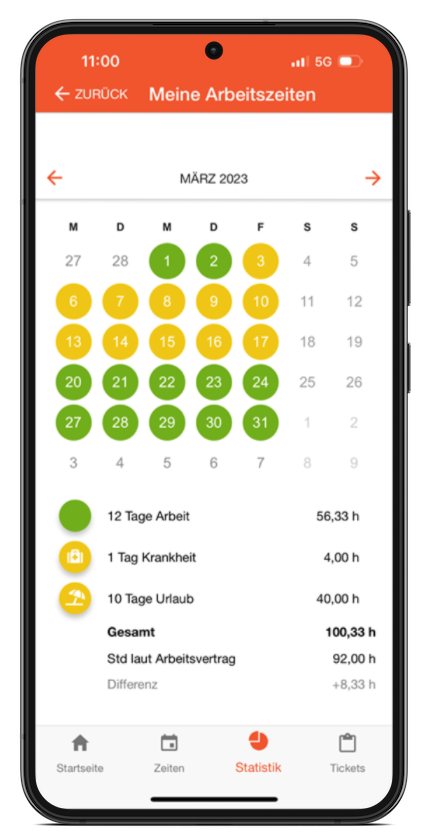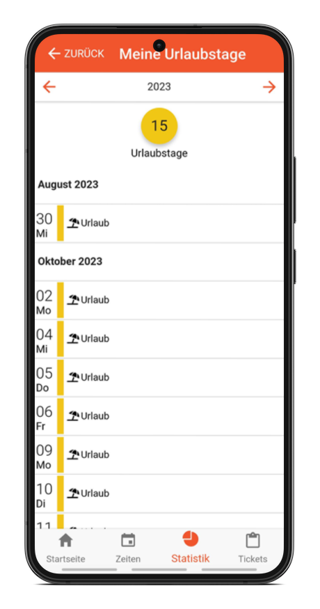 Im Bereich “Statistik” findest du Übersichten zu deinen Arbeitszeiten sowie zu deinen Urlaubstagen.
