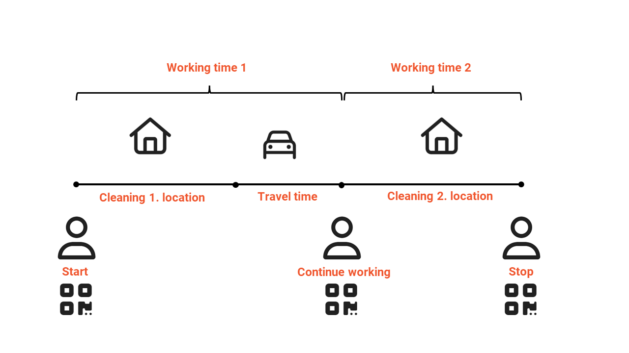 You are working back-to-back in two different locations and the transit time is to be taken into account. The "Continue working" feature allows you to "start" in the first location and "stop" in the second location. Then a dialog is displayed on which the cleaner decides whether to continue working or to stop the recording.