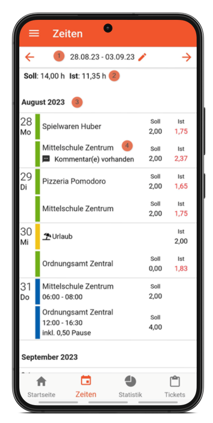 Die Ist-Zeit ist in roter Schrift, wenn es eine Differenz (nach unten und oben) zwischen Soll und Ist gibtBei geplanten Zeiten: die Anfangs- und Endzeit und ggf. eine eingeplante Pausenzeit
