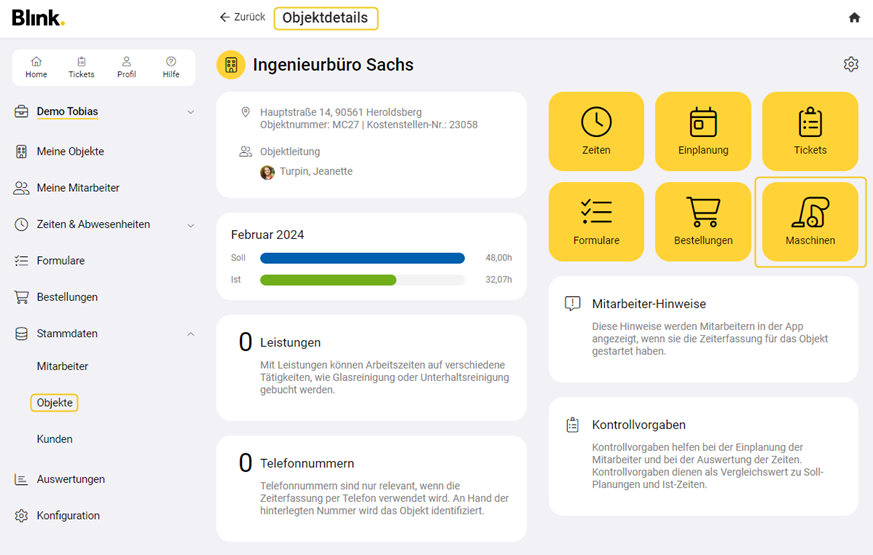 Stammdaten > Objekte > Objekt auswählen > Maschinen